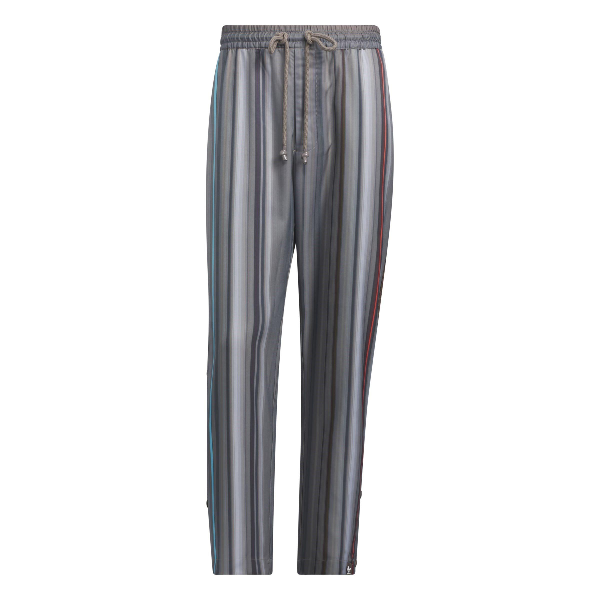 Impeccably crafted from 100% recycled polyester twill, these trousers are a testament to the brand's commitment to sustainability without compromising on style. The drawcord on the elastane waist ensures a personalized fit, while the regular cut and functional side and back pockets offer both comfort and convenience. Made with UNITEFIT, an all-gender fit system, these trousers were created to embrace a spectrum of sizes, genders, and forms. Equipped with snap button side hems, they provide a touch of versatility, allowing you to effortlessly switch up your look. To complete the design, the allover print pattern, inspired by the vibrant energy of the city, reimagines stripes as a stylish design element, adding a unique and eye-catching dimension to your wardrobe. Machine washable, follow care instructions.