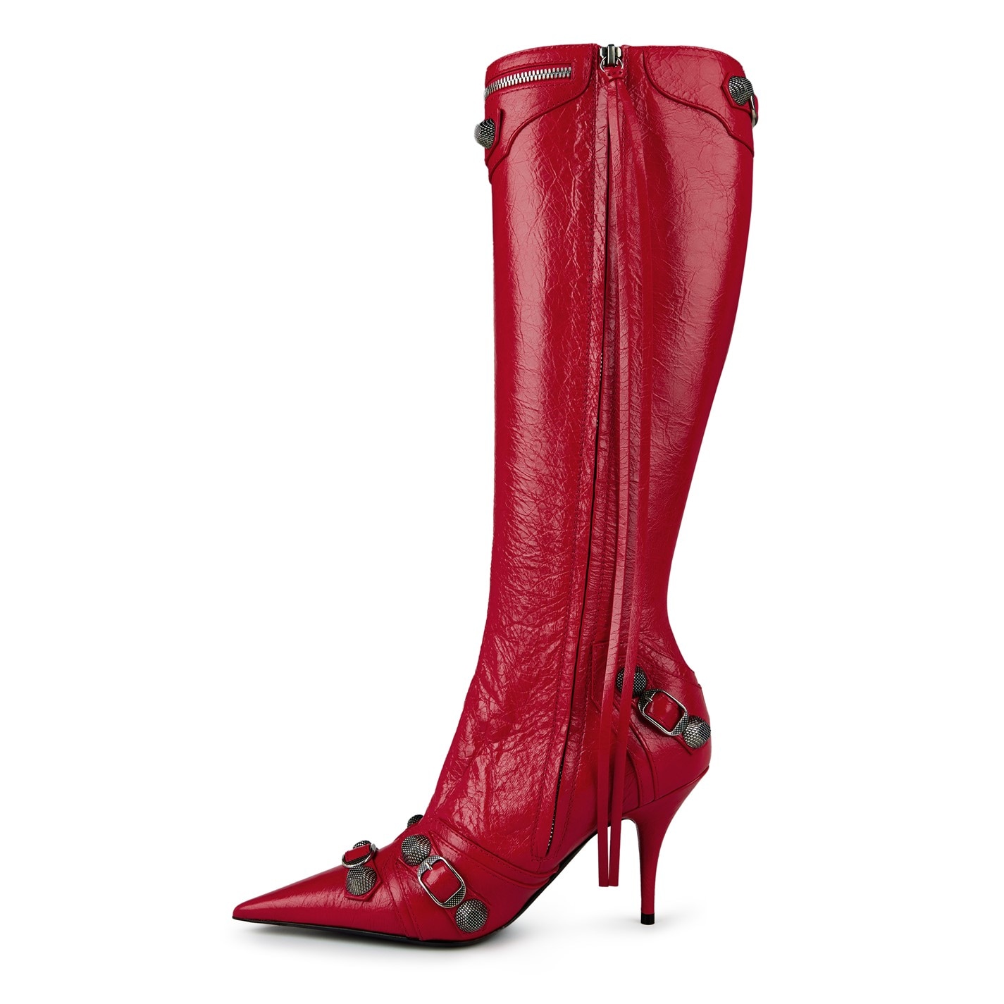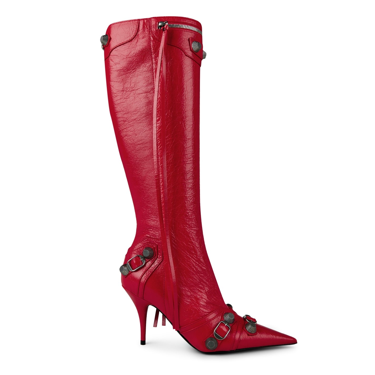 Made from luxurious lambskin textured leather, these knee-high boots exude sheer opulence at every step. The pointed toe adds a touch of sophistication and elegance, while the tone-on-tone covered stiletto heel elevates your stature to new heights. With an inner zip closure featuring a knotted leather puller detail, slipping into these boots is an effortless and indulgent experience. The aged silver-tone stud and buckle detailing on the shoe add a hint of rebellious charm, a nod to Balenciaga's signature aesthetic. The zip detail at the top, adorned with a knotted leather puller, not only adds a stylish twist but also ensures a secure and comfortable fit. Designed for those unforgettable evening events, these Cagole Heeled Boots are the epitome of glamour and allure. Whether you're attending a red-carpet affair or a cocktail soirée, these boots will make an unforgettable statement that reflects your impeccable sense of style and taste. Material: 100% Lambskin. Care: Clean with a soft dry cloth. Heel Height: 90mm/ 3.5 inches. Dustbag included.