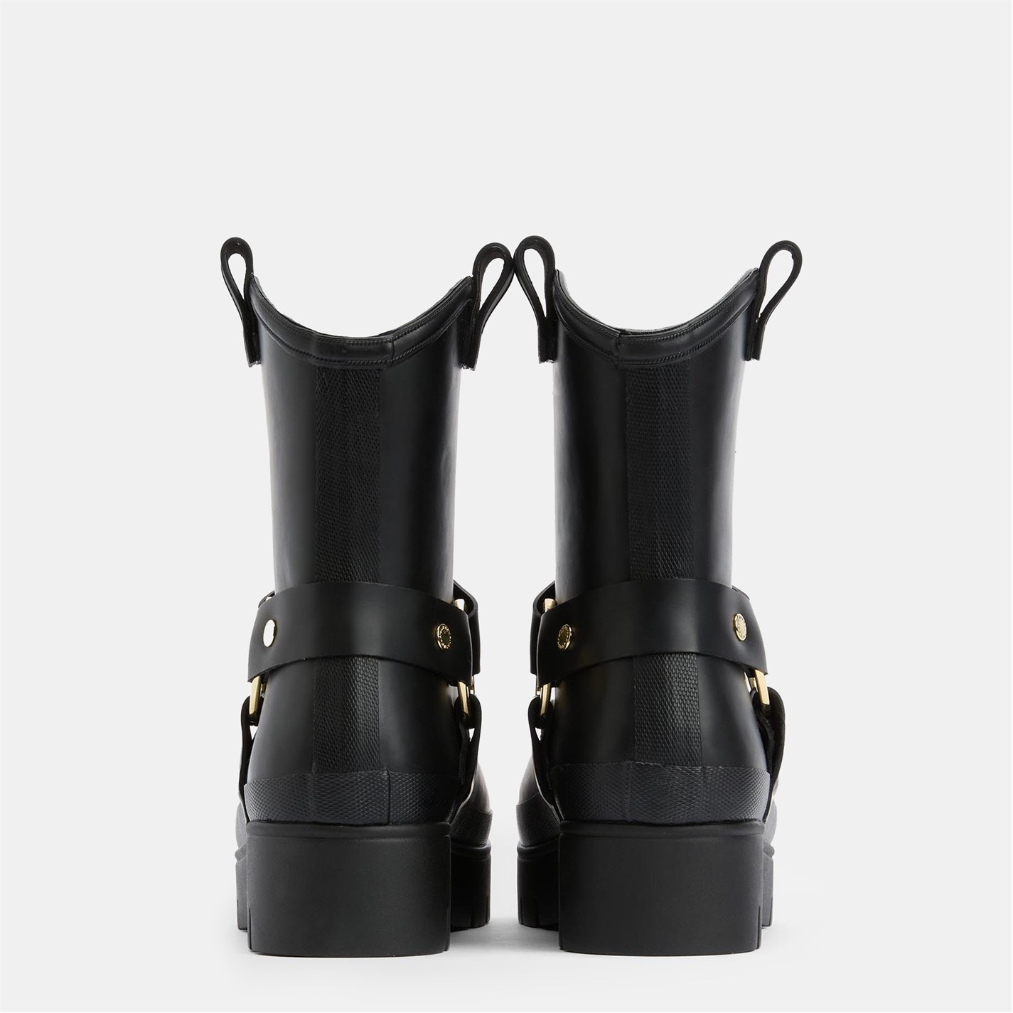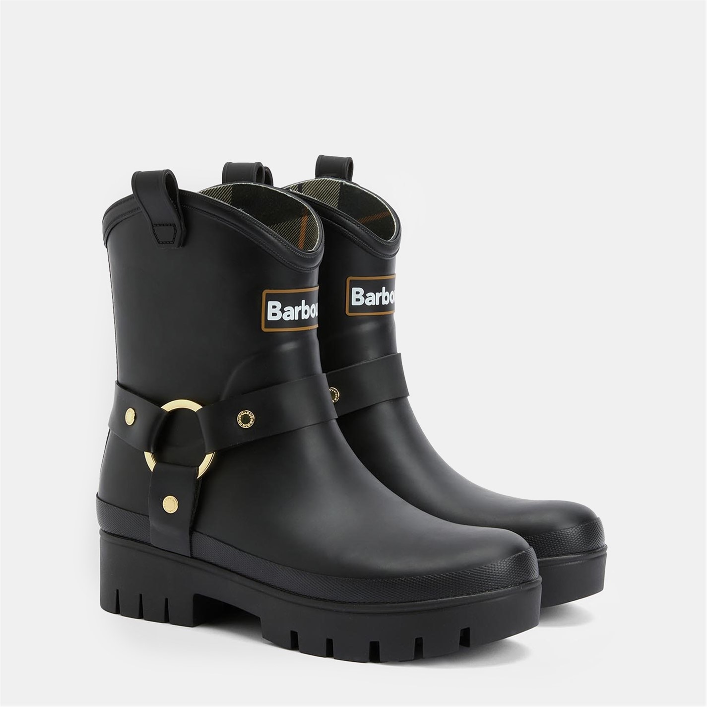 The Barbour Elley Harness Wellington Boots blend rugged biker-inspired style with practical comfort. Crafted with a low-leg silhouette, chunky lug sole, signature Barbour rivets, and bold ring detailing, these boots offer durability with distinctive flair. Finished with a Barbour-branded plug for added authenticity. Perfect for rainy city strolls or countryside walks with edge and attitude.