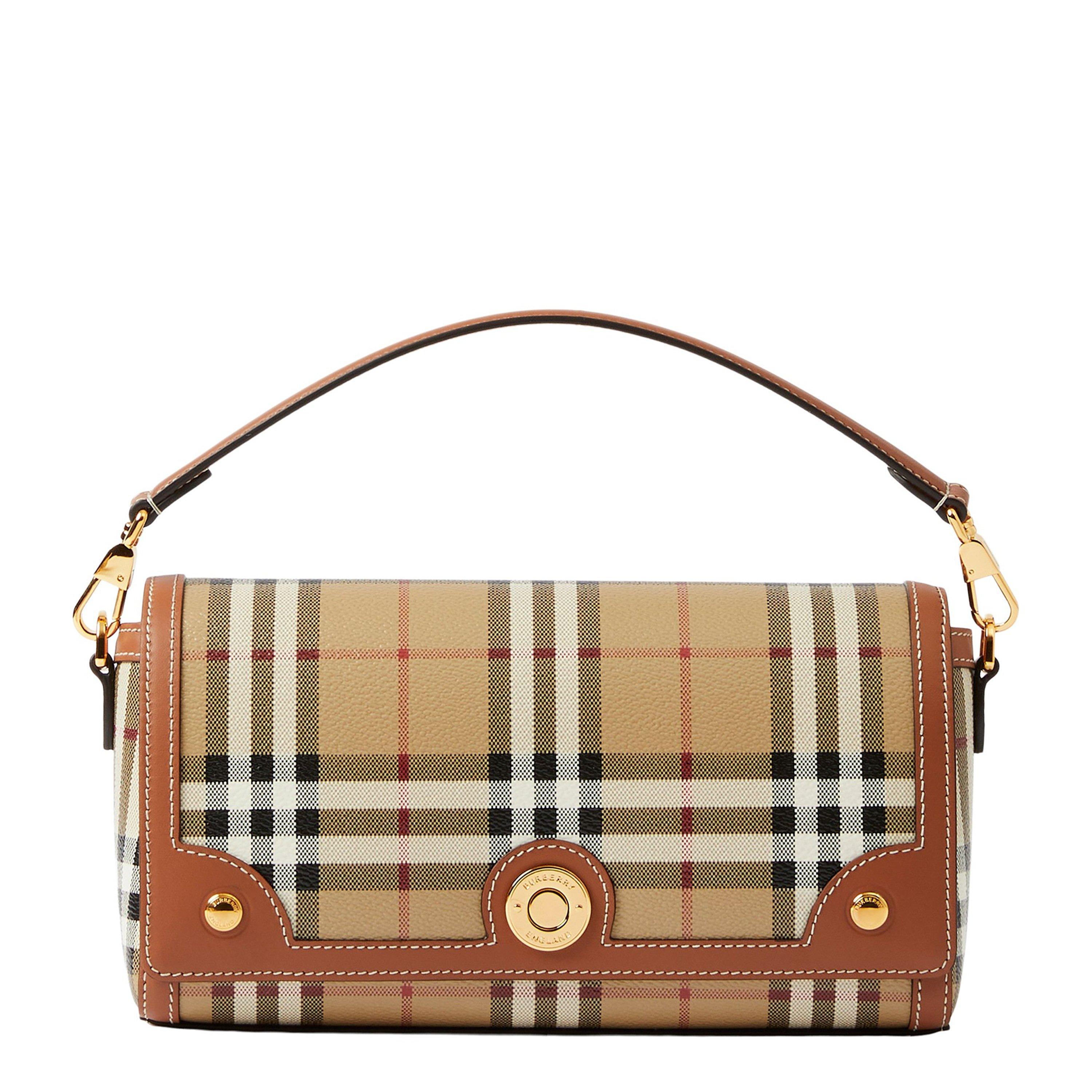 Burberry's Top Handle Note Bag seamlessly combines heritage design with modern functionality. This refined small handbag showcases the iconic archival check pattern, hand-painted edges, and gleaming gold-tone hardware, making it perfect for both business meetings and weekend brunches.