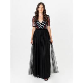 Maya Charcoal Fully Embellished Maxi Sleeve Midi Dress with Frill Detail