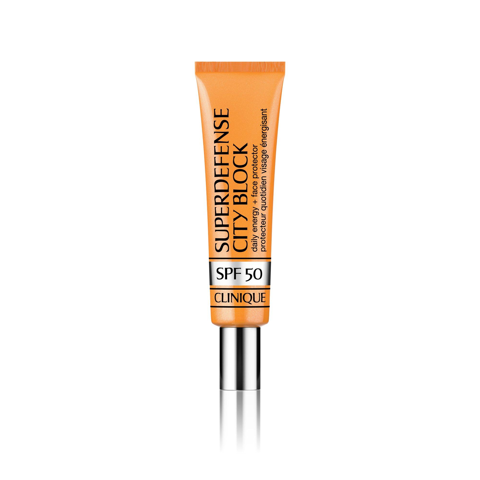 THE STORY BEHIND SUPERDEFENSE CITY BLOCK DAILY ENERGY + FACE PROTECTOR SPF 50. Did you know up to 90% of visible aging is caused by UV rays? Defend and awaken skin with Superdefense City Block Daily Energy + Face Protector SPF50. Prime and energize skin with this daily SPF protector, while safeguarding it from the sun that can lead to visible signs of aging. Sheer, weightless, oil-free formula quickly absorbs while prepping skin for makeup.