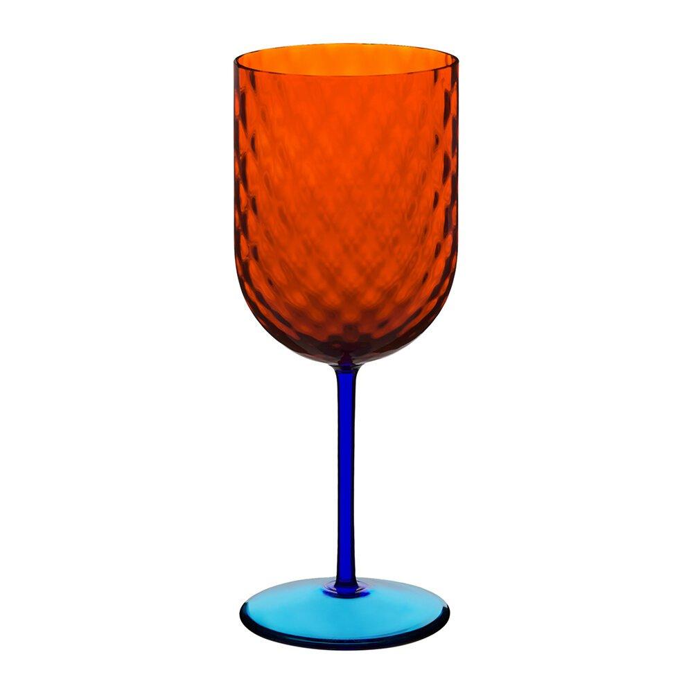 Delicately crafted from mouth-blown Murano glass, the Sicilian folklore-inspired Carretto red wine glass from Dolce & Gabbana Casa features a textured, diamond-shape patterned, transparent bowl in a deep orange hue with a contrasting blue stem and base. Striking and sophisticated.