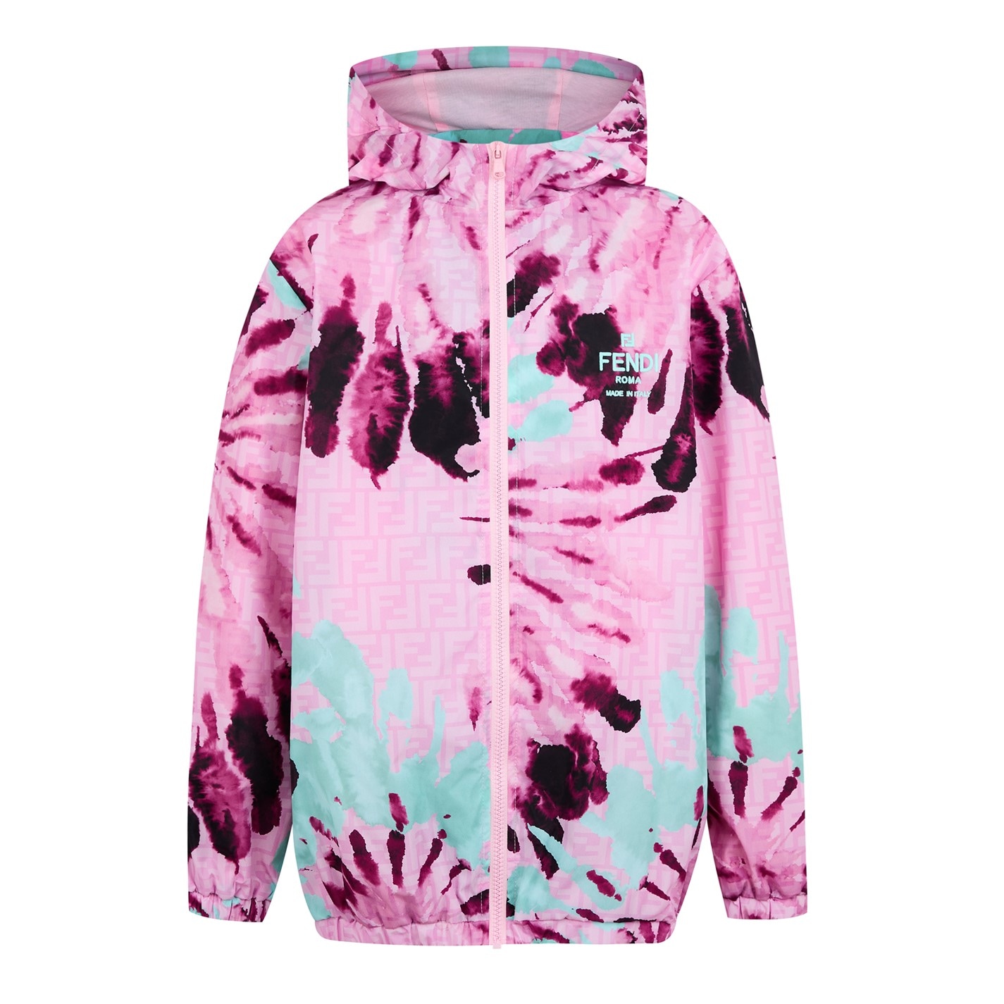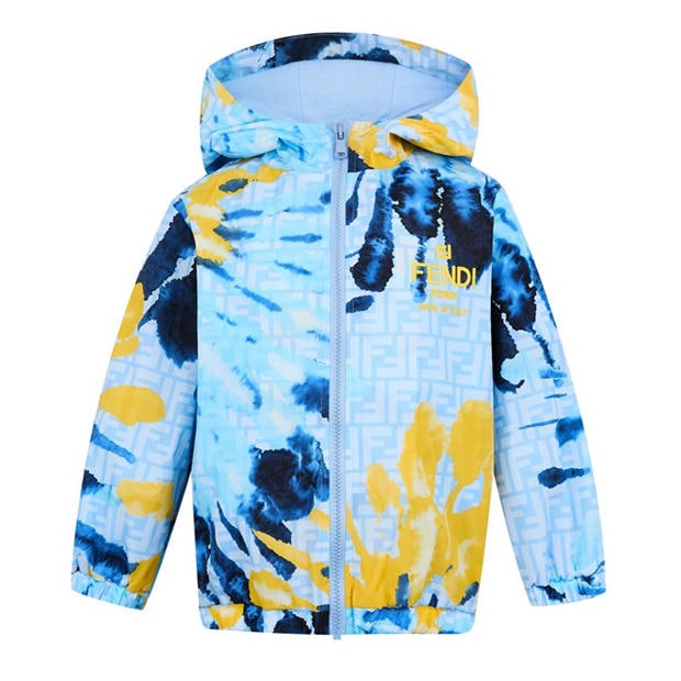 The Fendi Unisex Kids Tie Dye Hooded Long Sleeve Rain Anorak brings a playful style to wet-weather protection. Made from innovative fabric with an eye-catching pattern, this windbreaker jacket features elastic trims, a secure central zip fastening, and the Double F logo featured on the chest.