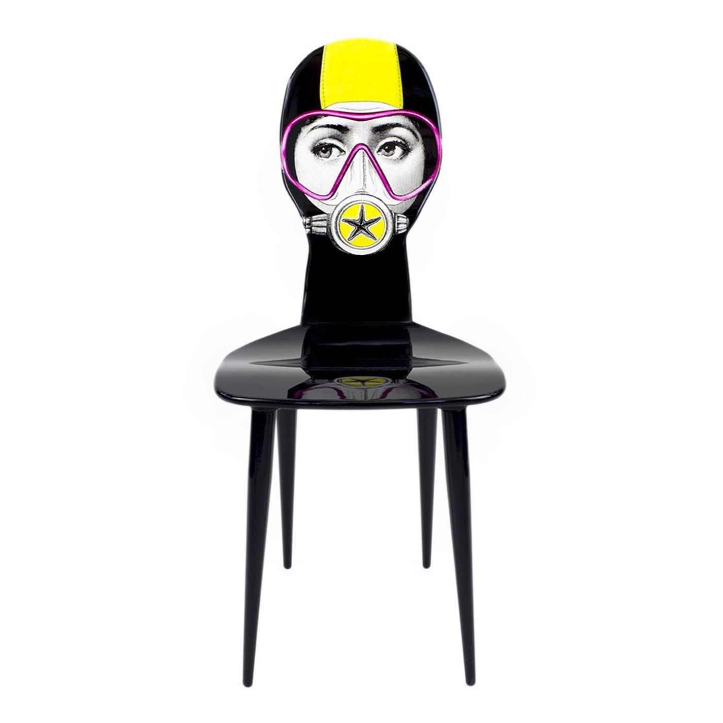Create an eye-catching statement in any room of the home with this stunning Silviasub chair from Fornasetti. This elegant black chair is finished with a striking backrest featuring the iconic face of opera singer Lina Cavalieri wearing a deep sea diving mask. Perfect for practical use or as an indulgent decorative piece, team with more items available separately from Fornasetti to transform your interior.
