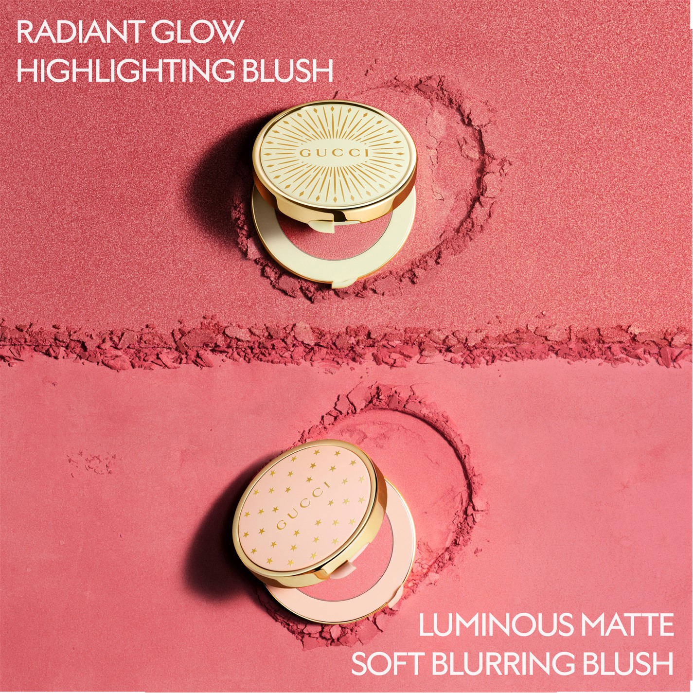 The line-up is composed of 6 vibrant and fresh inclusive shades, suitable for all skin tones from fair to deep, ranging from a frosted pink to a universal berry bright red. Gucci Glow Blush has a luxury ivory case adorned with a Gucci gold linear pattern that echoes the Gucci Glow franchise codes, a gold compact, and a mirror inside.