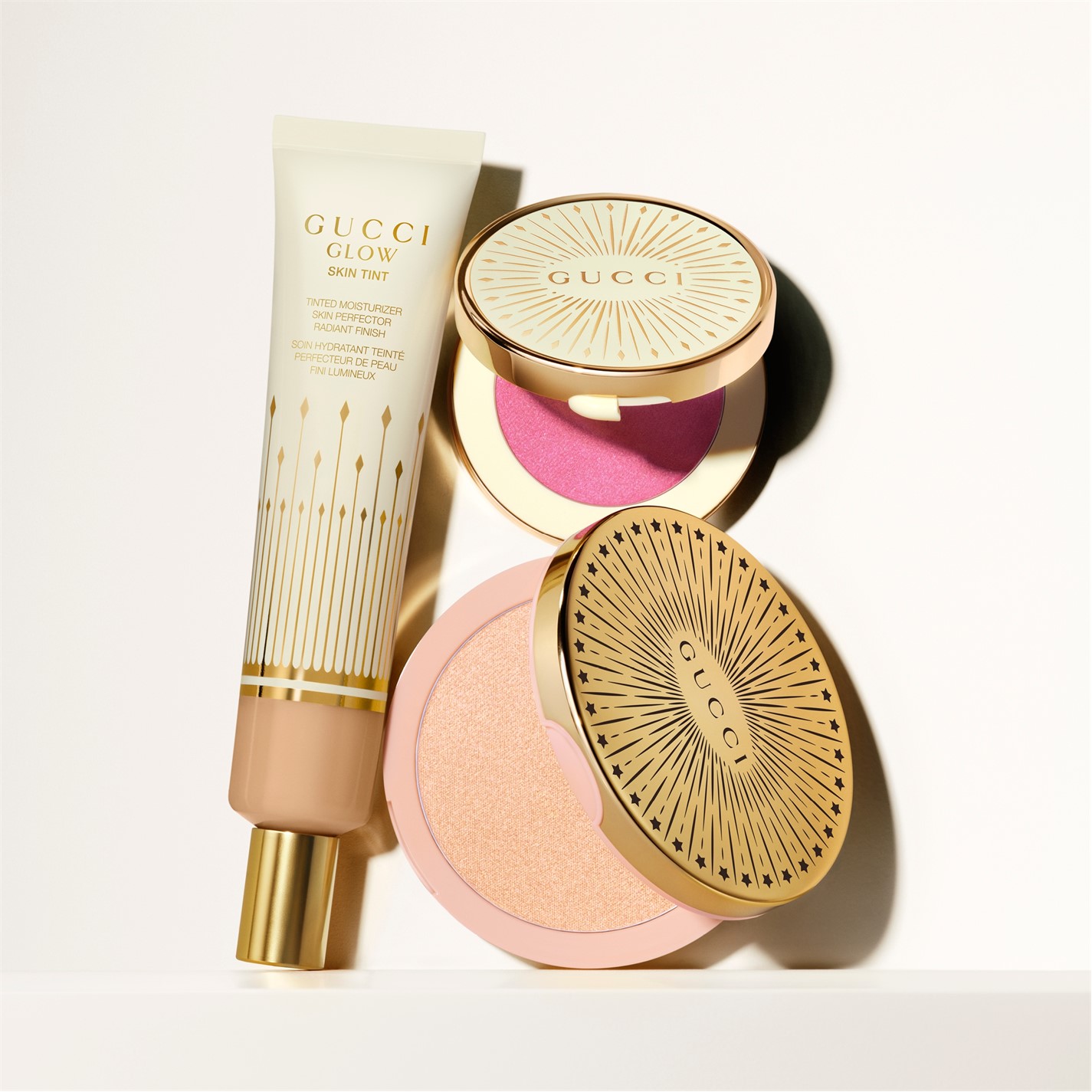 The line-up is composed of 6 vibrant and fresh inclusive shades, suitable for all skin tones from fair to deep, ranging from a frosted pink to a universal berry bright red. Gucci Glow Blush has a luxury ivory case adorned with a Gucci gold linear pattern that echoes the Gucci Glow franchise codes, a gold compact, and a mirror inside.