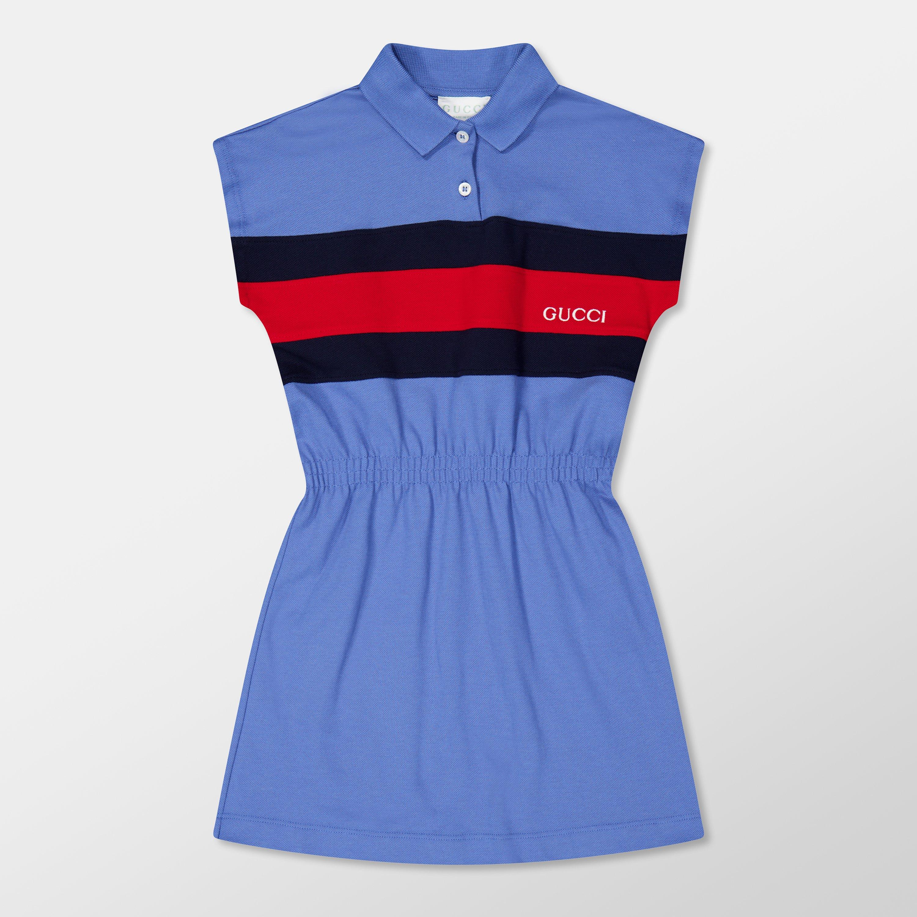 Elevate your mini-me's style with Gucci's Polo Dress, a brand synonymous with luxury and Italian craftsmanship. Adorned with the iconic logo embroidered and the signature web detailing, exuding a well-known designer stamp. From playdates to family occasions, this mini dress is perfect for your young one.