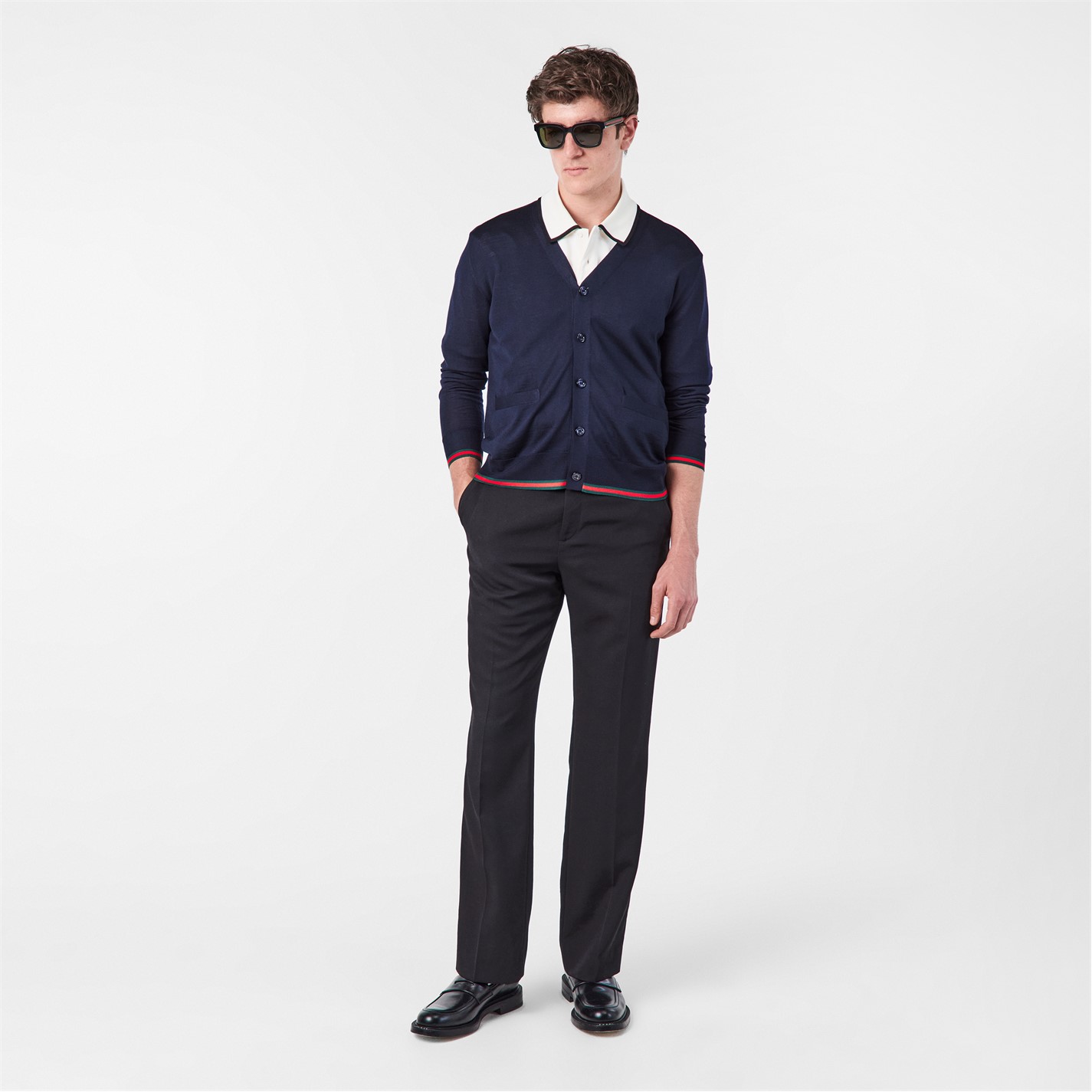 Bring fine Italian craftsmanship to your wardrobe staples with Gucci's sleek Web Knit Cardigan. Meticulously fashioned in a combination of wool and super-soft cashmere and featuring dropped shoulders for a roomy fit, this men's cardigan is perfect for the office, fashion-forward events or romantic dates with a loved one.