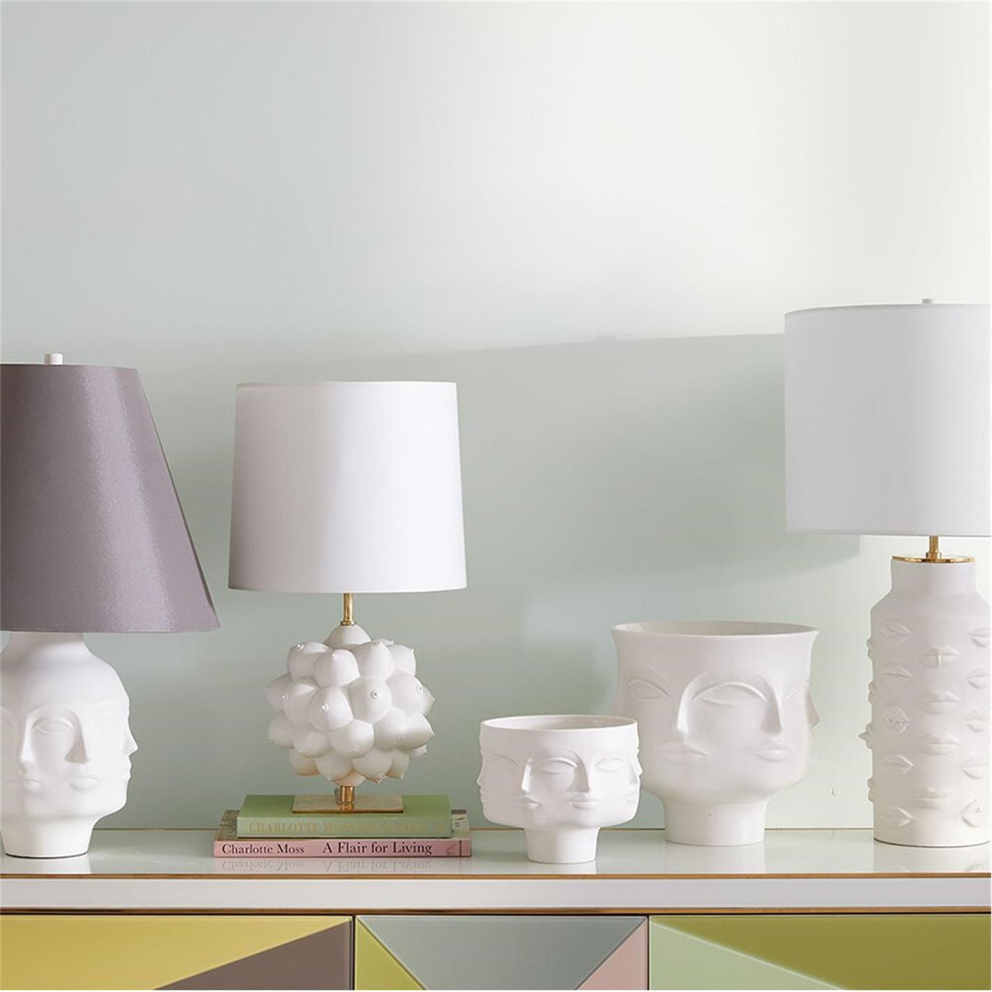 The Georgia Table Lamp by Jonathan Adler is an exquisite piece of art that celebrates creativity in every direction. This beautiful lamp features a cluster of perfectly shaped forms that are crowned with a white paper shade, creating a mesmerizing orb that sits beautifully on a sturdy brass base. This lamp is inspired by the famous American artist Georgia O'Keeffe.