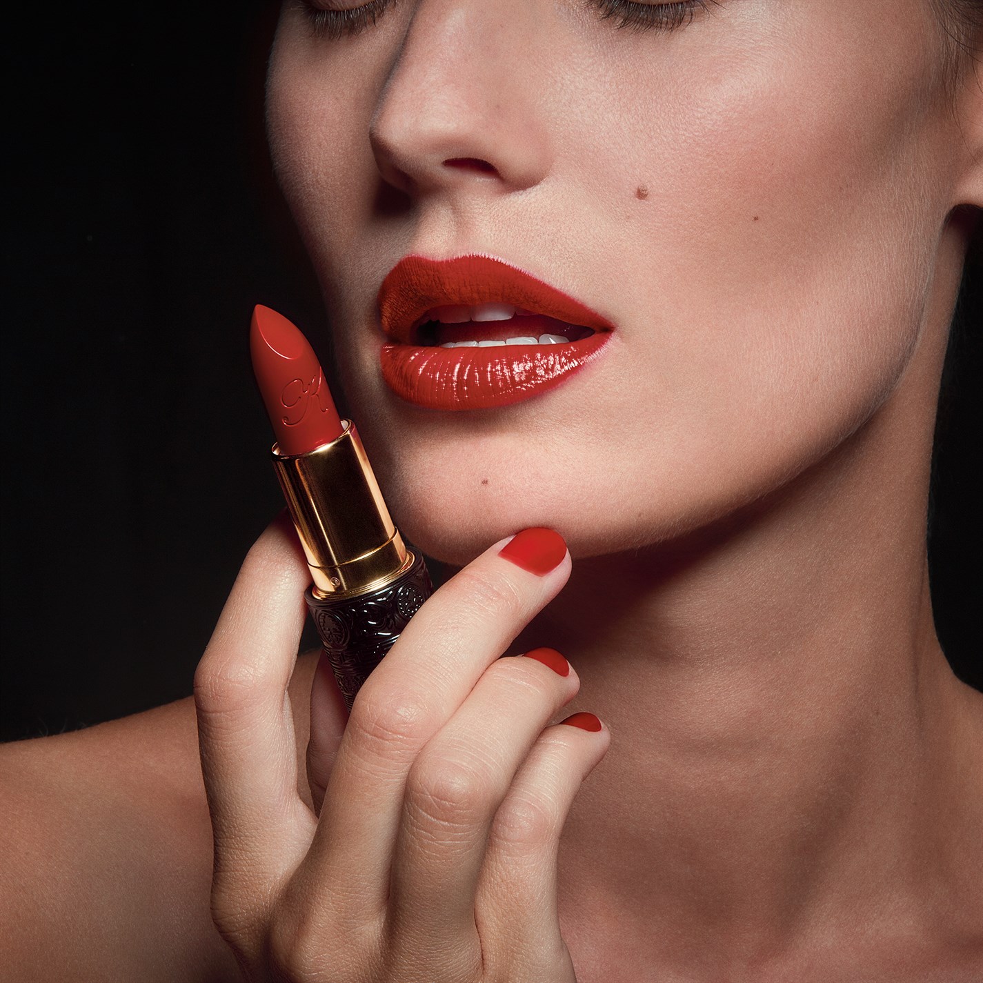 Begin the application of your perfect red at the heart of the lip, gradually building color towards the outside. Using the sharper edge of your lipstick, perfect the inner part for your lower lip and the lip corners. For gourmand lips with volume, try mixing both finishes: begin with the Matte texture and add Satin in the center of your lips for a plump, multi-dimensional finish.