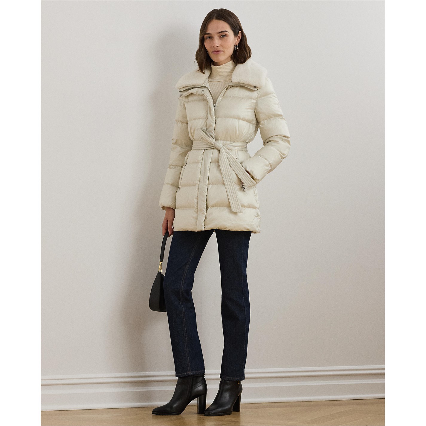 Elevate your winter wardrobe with the Ralph Lauren Faux-Shearling-Trim Belted Down Coat. Ideal for colder climates, this channel-quilted coat features a smooth, water-resistant shell with an iridescent finish, complete with removable faux-shearling trim on the collar for both warmth and style. With plush 650-fill-power-down insulation, it ensures optimal comfort and cosiness in chilly weather.