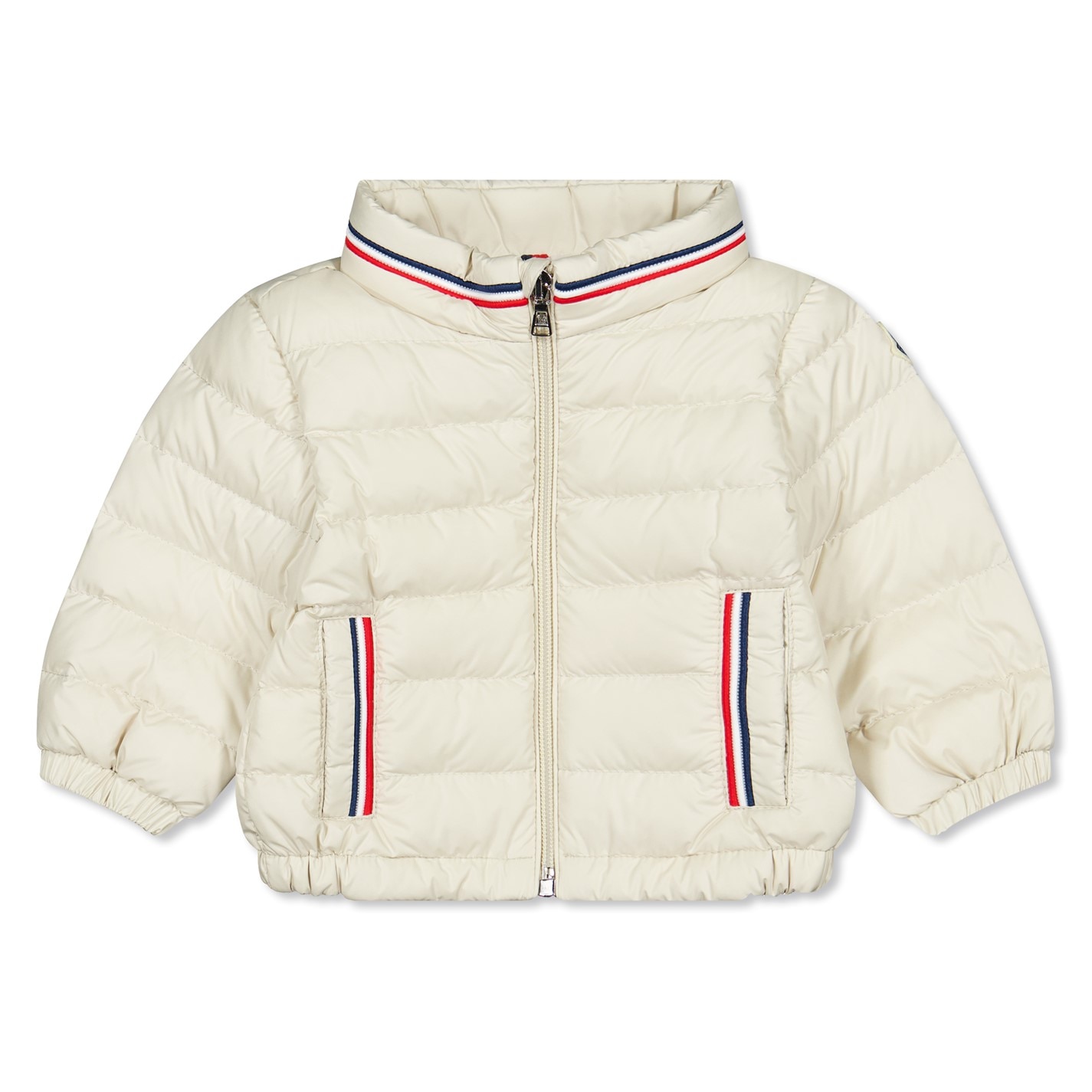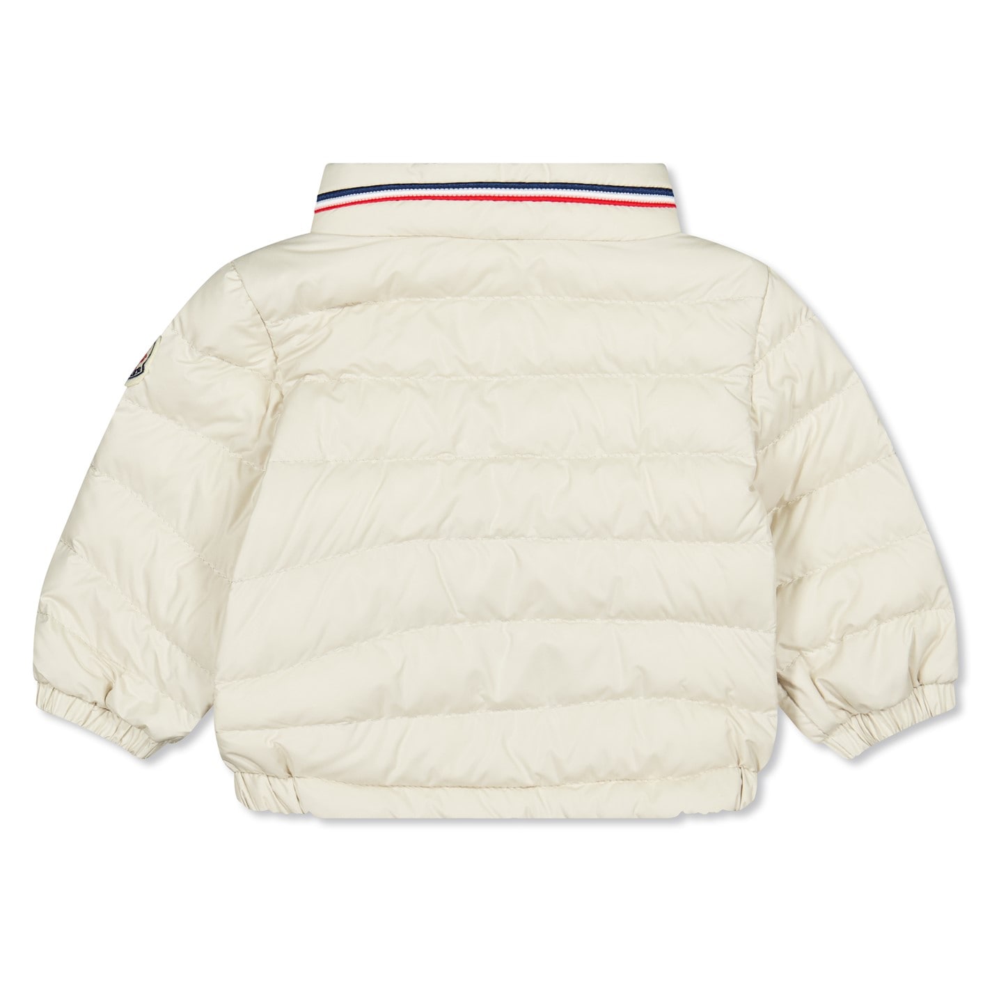 - Moncler's signature tricolour adorns the collar and pocket trims, while the felted patch on the sleeve ensures brand recognition.