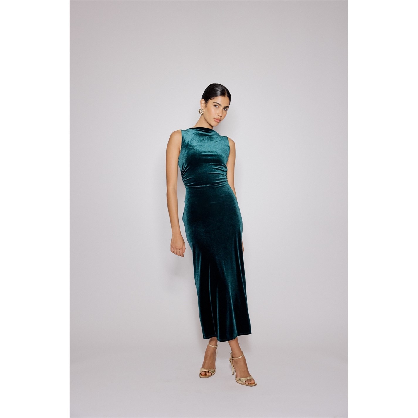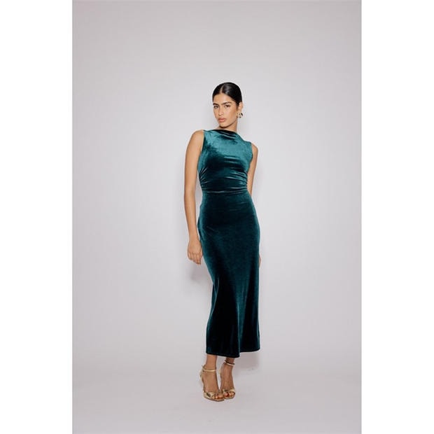 The Margot Maxi Dress from Nobodys Child features a fitted bodice with side ruching and a long relaxed skirt in soft fabric. This women's dress showcases a boat neck complemented by an open back with twist detailing.