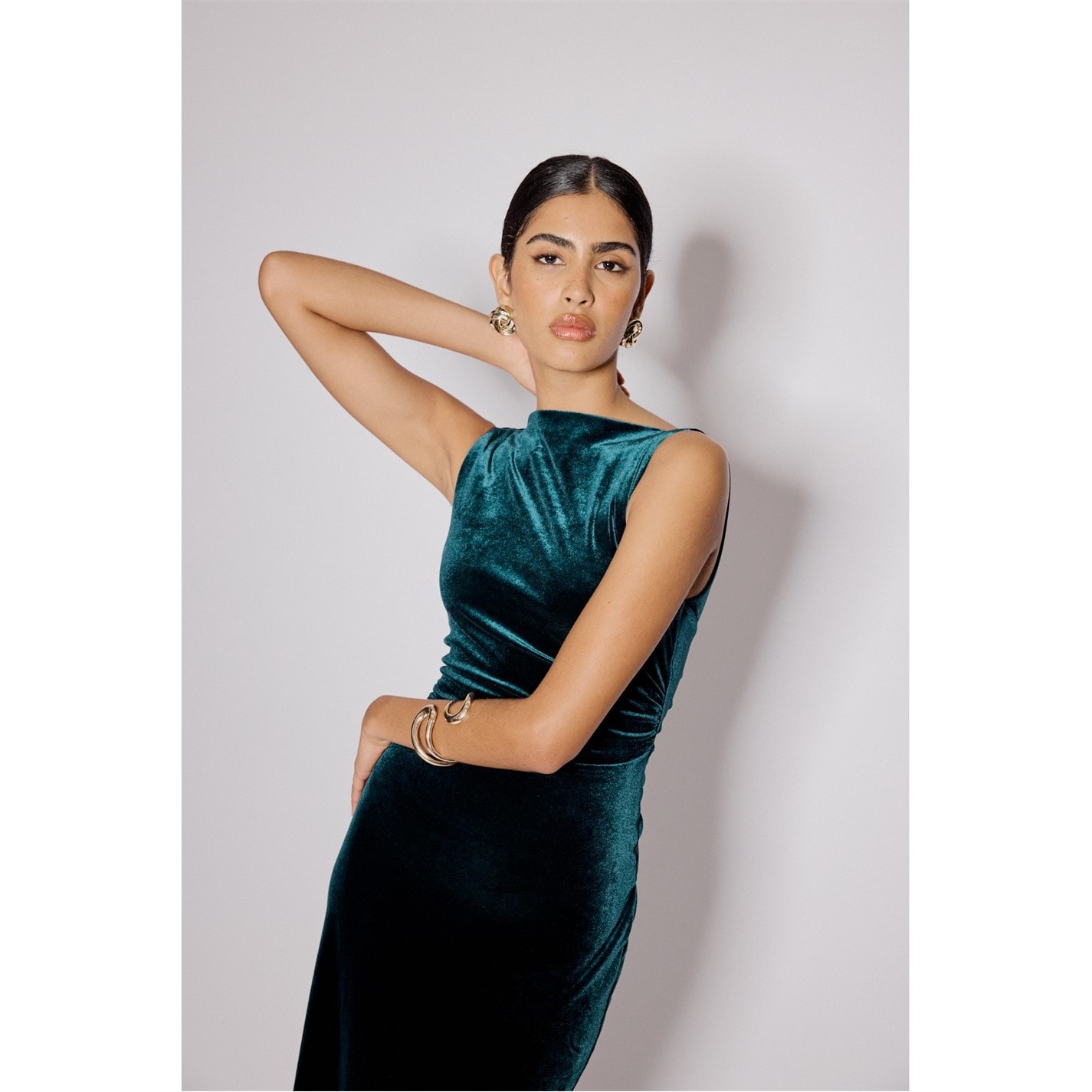 - Boat neckline with side ruching