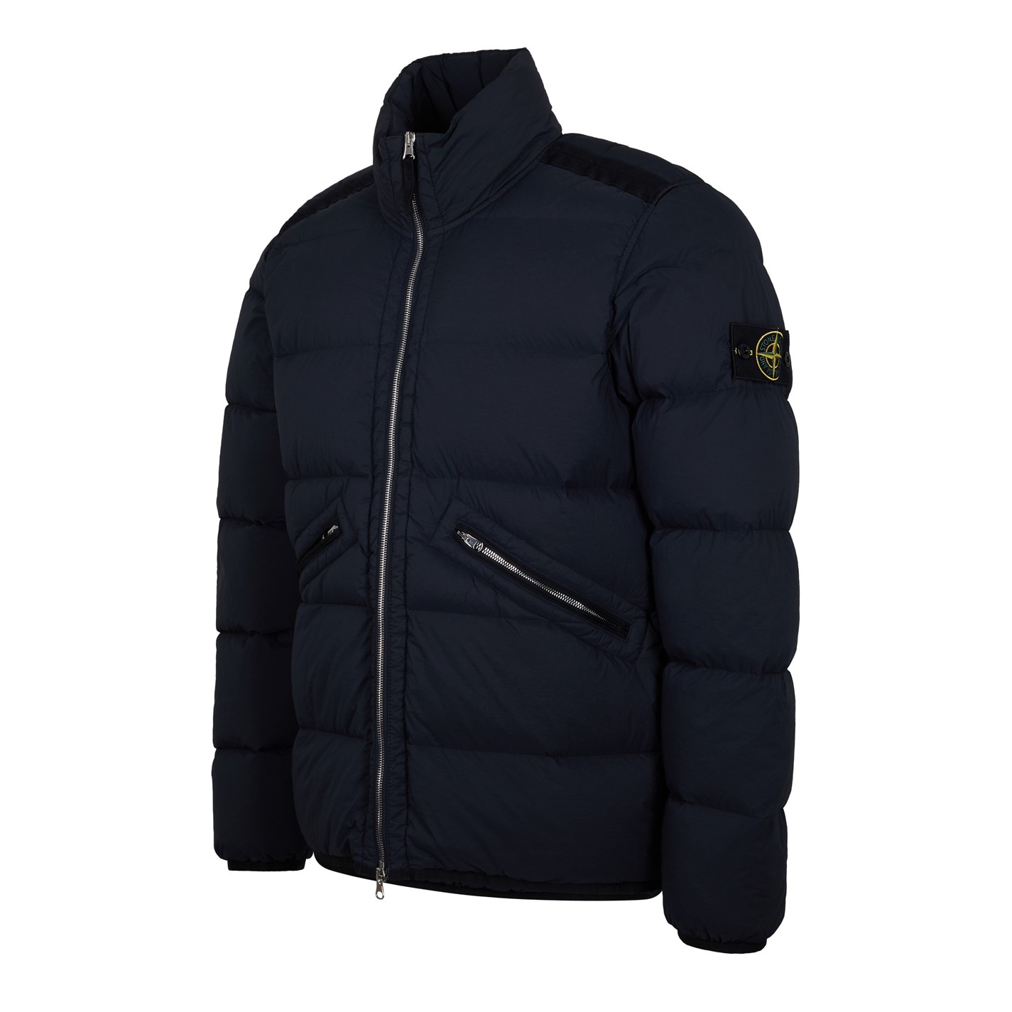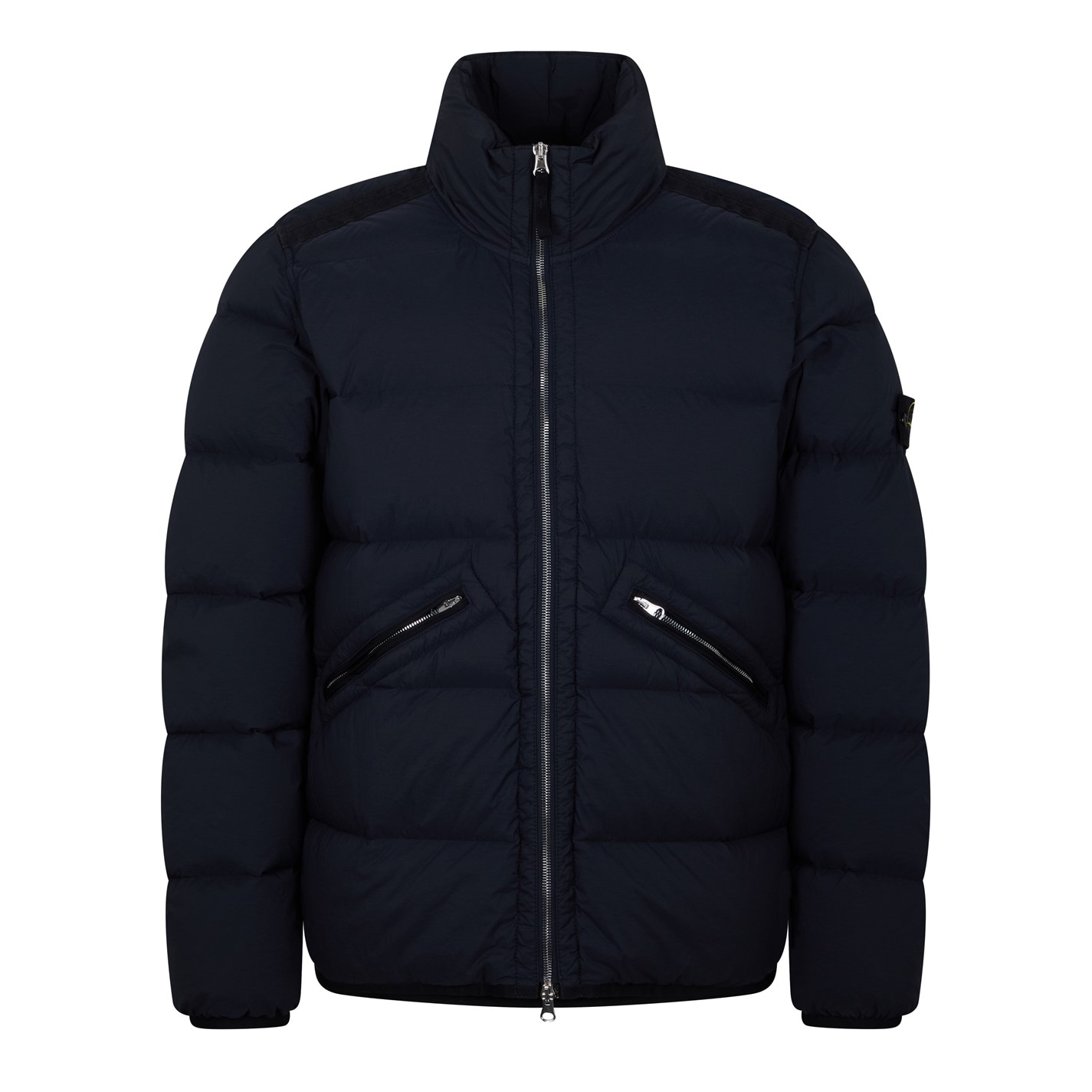 Stone Island Short Puffer Jacket delivers luxurious warmth with practical design. The brand detailing on the sleeve provides instant recognition, while the stand collar and two-way zip fastening offer protection in a standard fit for cold weather fashion styling.