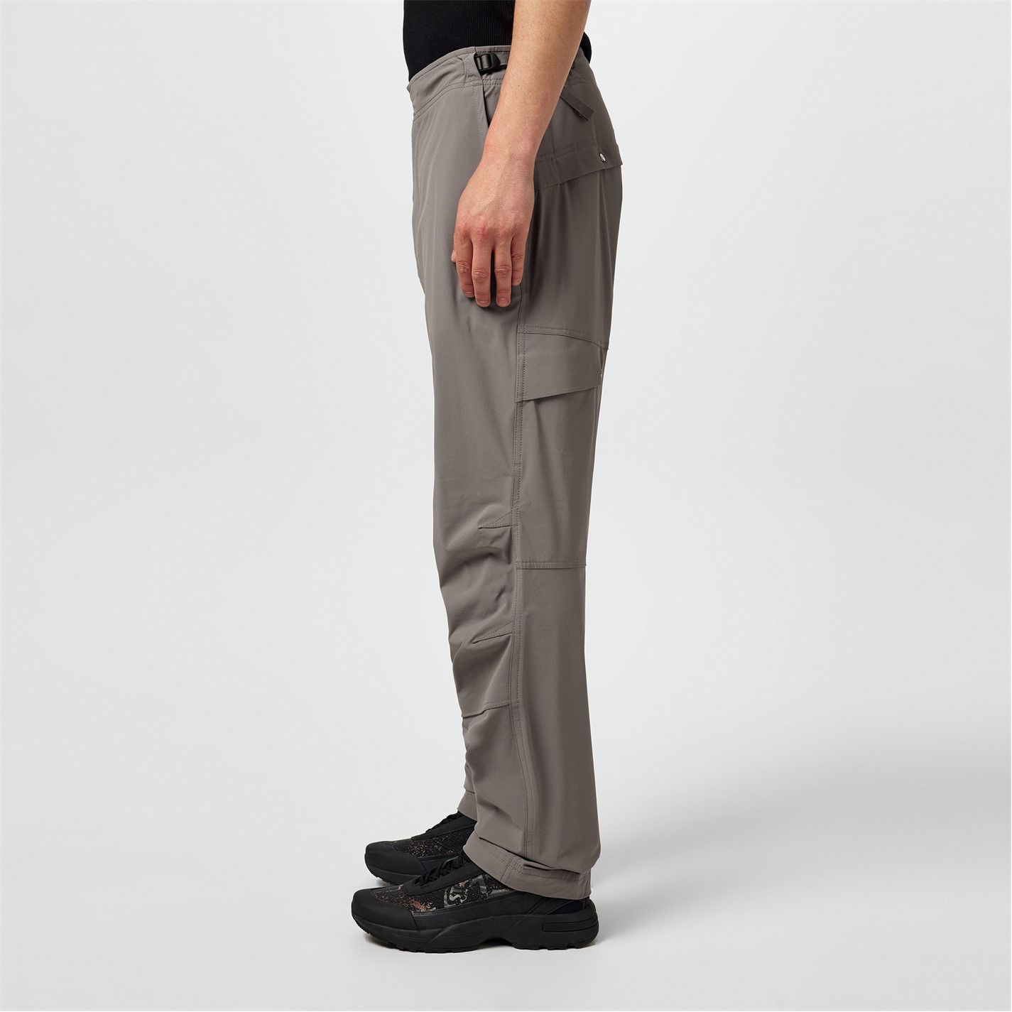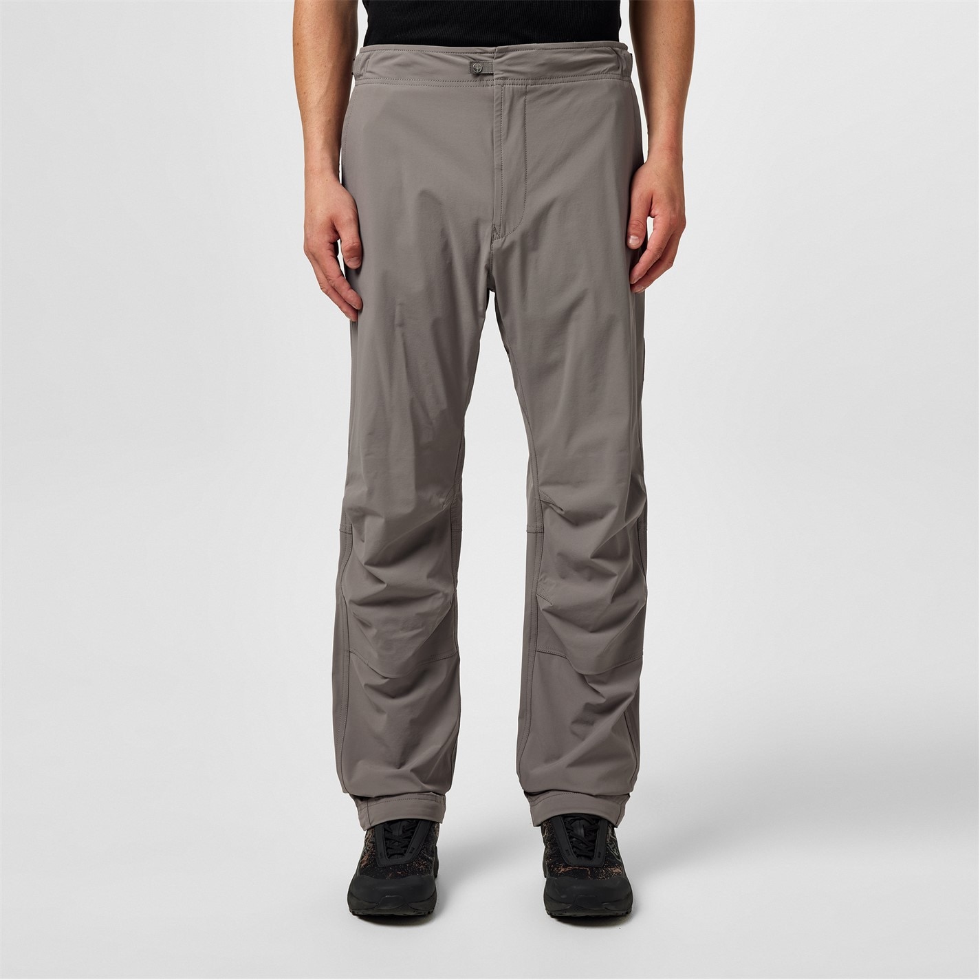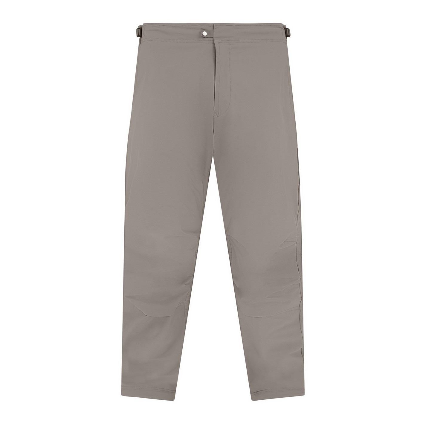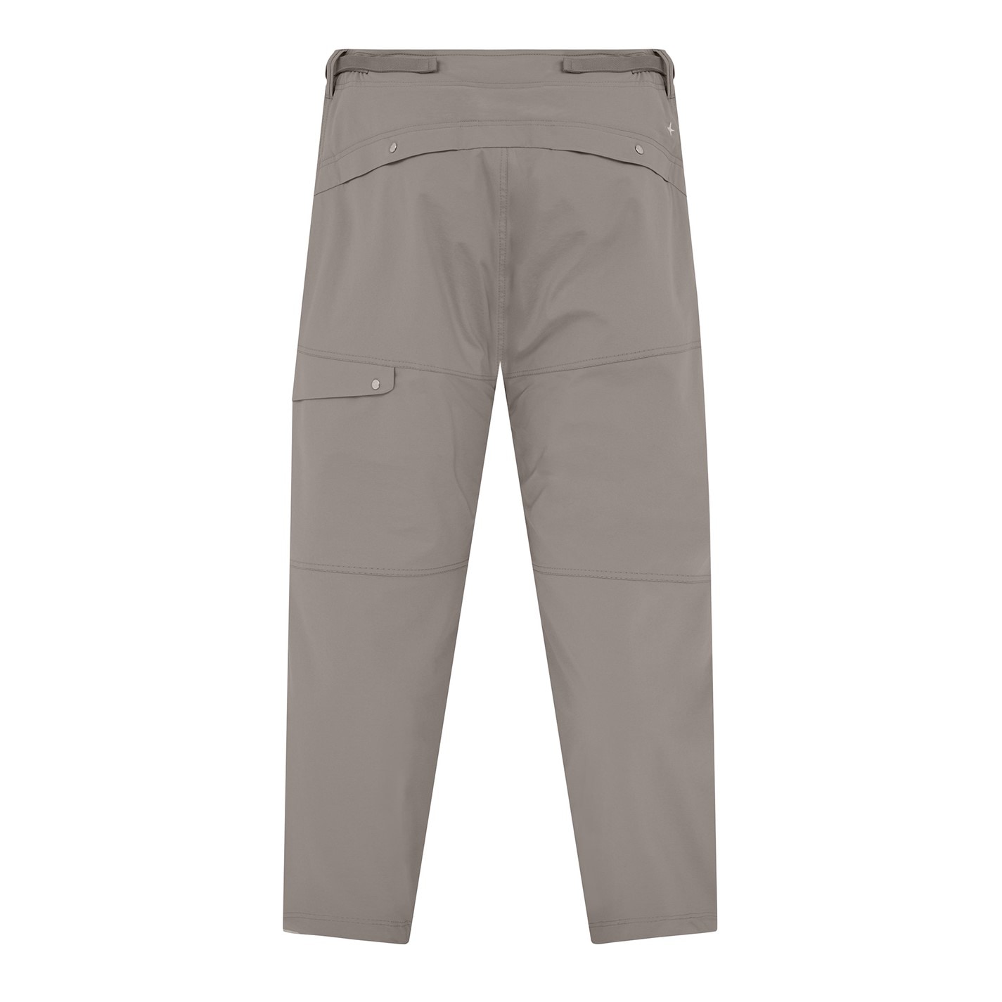 Pants in 84% recycled bi-stretch nylon tela. The piece mixes regular and hi-tech stitching techniques. Regular fit. Slanting hand pockets, with small triangular appliqué. Horizontal band on back, serving as fixed flap entrance for the pockets with snap fastening; the band is reinforced by bonding two layers of self-fabric. Above, on the right side, embroidery of the Stone Island little star. One pocket on the left leg, with slanting flap and snap fastening; the flap is reinforced by bonding two layers of self-fabric. Heavily shaped knees, with two layers construction. Side adjustable tape straps with buckle on the waistband. Zip and adjustable snap fly, with buttoned inner flap.