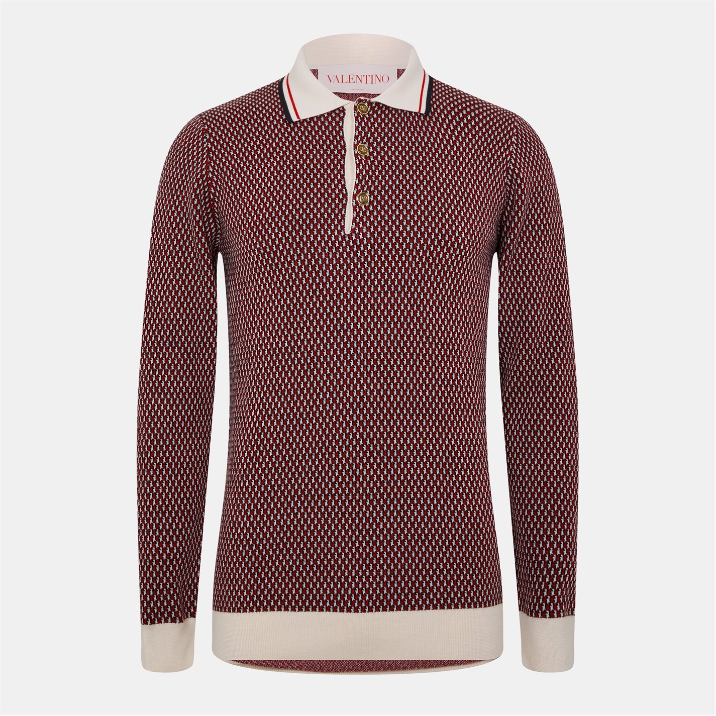 Elevate your wardrobe with this Valentino Garavani Knitted Polo Shirt, a luxurious piece from Valentino's Ready to Wear collection. Crafted with patterned jacquard and accented by a tipped collar, this polo seamlessly blends smart and casual to offer versatility and comfort. Whether you're heading into the office, out into town, or relaxing on a lazy weekend, this long-sleeve polo shirt ensures you're doing it in style.
