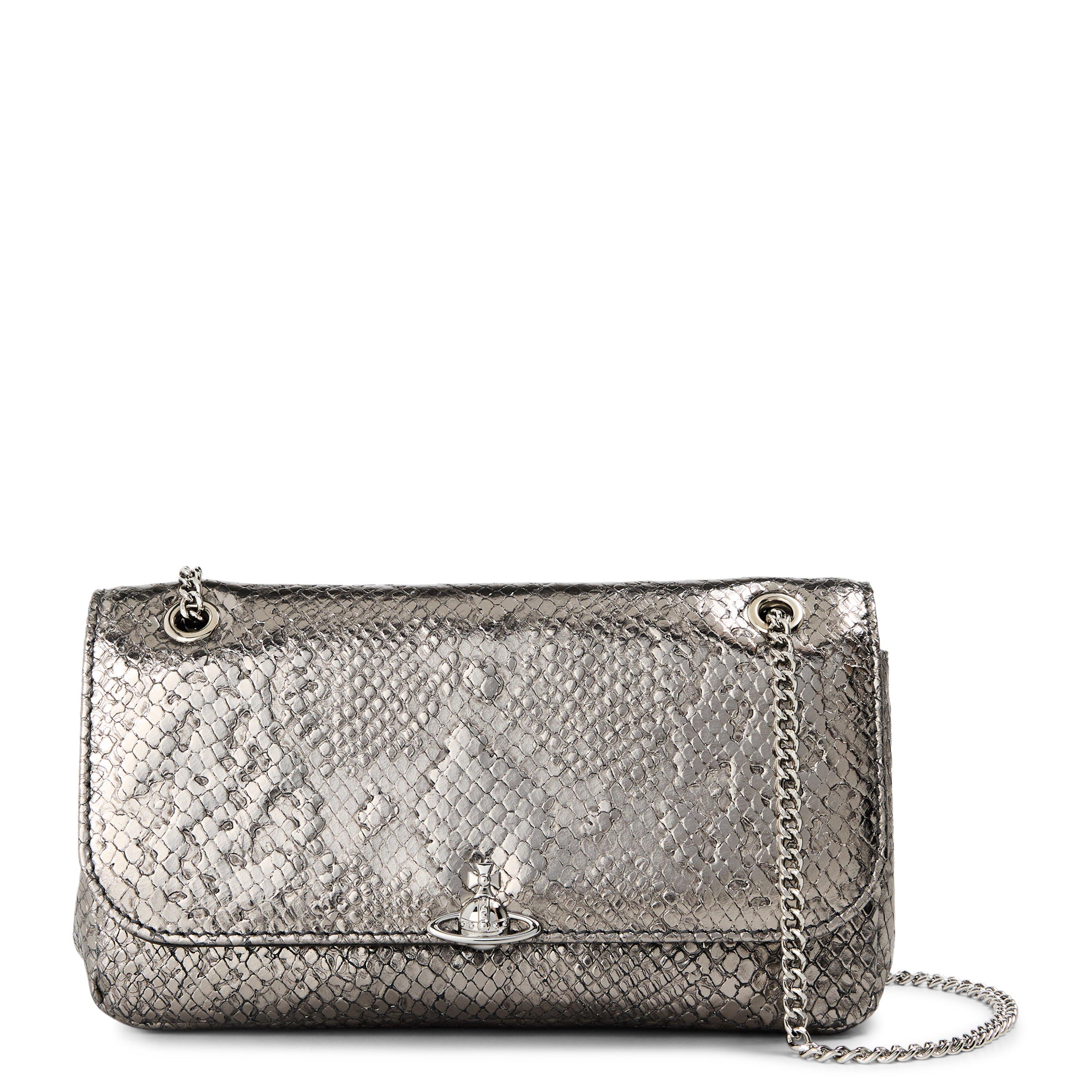 The Vivienne Westwood Viv Chain Crossbody Bag features a compact design. Its streamlined style maintains a low profile for easy everyday carrying.