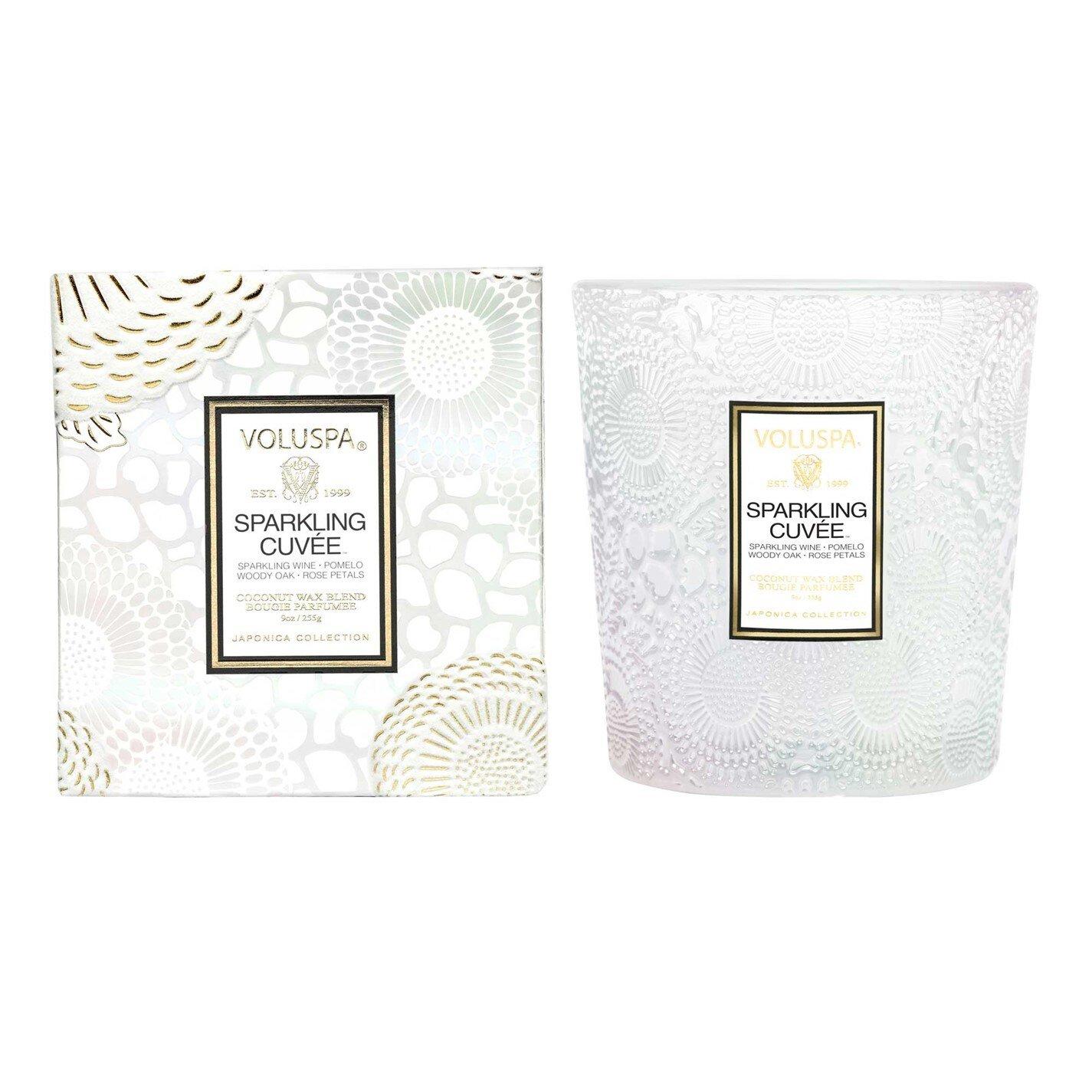 Sparkling Cuvee: Pop a bottle of Voluspa’s finest blend, it’s time to celebrate! A mix of beautiful aromatic complexity, Sparkling Cuvée opens with vivacious fruit tones of Sparkling Wine, Pomelo and Red Currant. The effervescence of Sparkling Wine is the heart of the celebration, with bubbles cascading to the surface, dancing and mingling with juicy Nectarine and Bulgarian Rose Petals. A velvety, smooth finish of Woody Oak serves as the perfect stage for this aromatic affair. Raise a glass of Sparkling Cuvée, your olfactory aperitif for every unforgettable occasion.