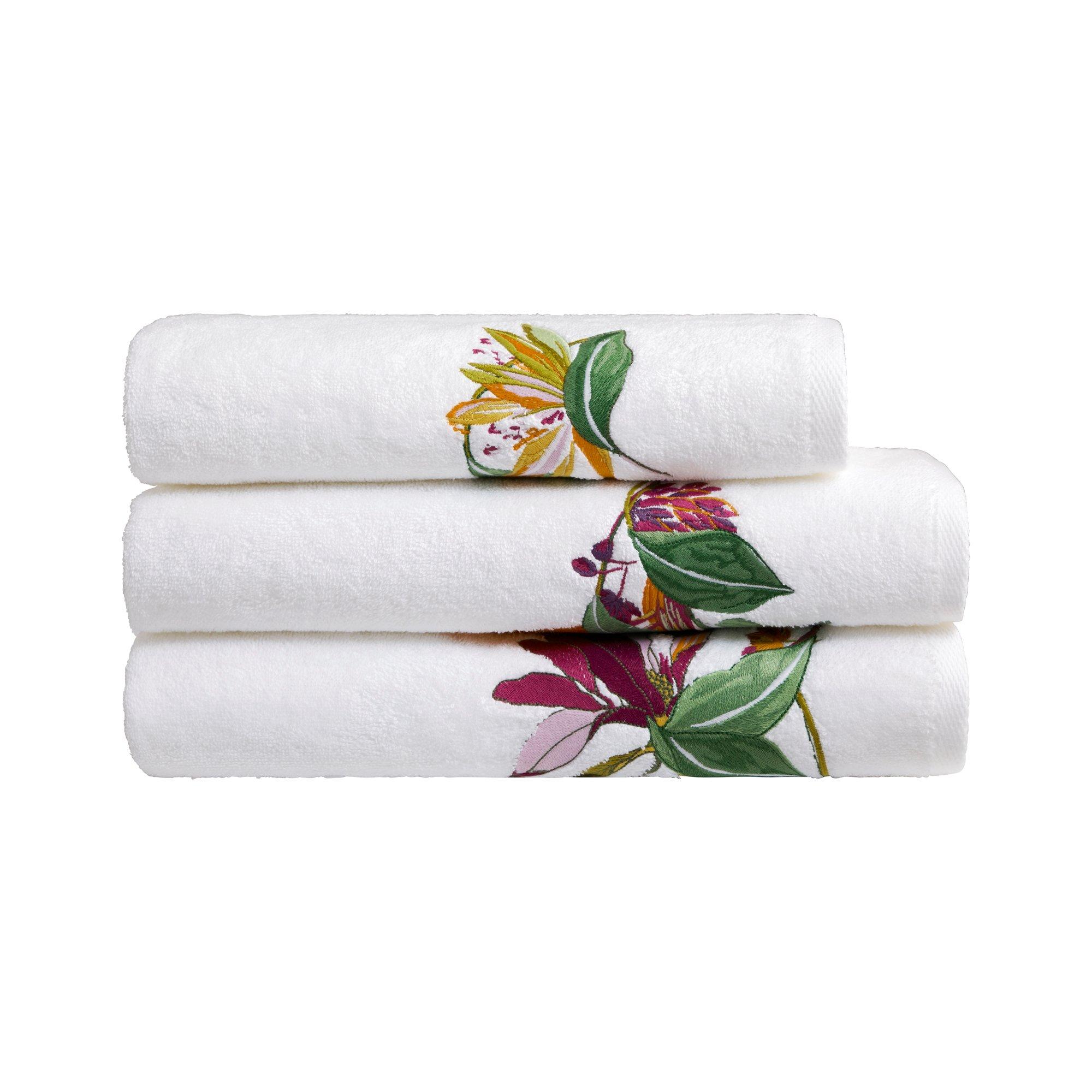 A summery collection of bath towels by Yves Delorme. The designs are defined by their vibrant floral embroideries, each size offering a slightly different take, which are further emboldened by the contrast created by a plain white backdrop of an organic terry cotton blend. The soft, fast-absorbing towels are finished with a tonal border trim. 83% Organic Cotton 17% Modal